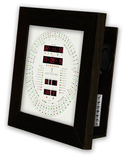This Clock displays the DCF77 time code on 2 rings of 60 LEDs on a large 12" (305mm) diameter dial. The inner ring shows the live time code for the next minute as it is received and the outer ring shows the current time as long as the previous minute was received error free.