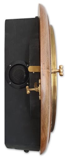 The dial has been removed showing the dial mounting holes on the wood surround and the wooden back box behind it.