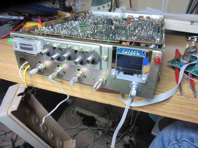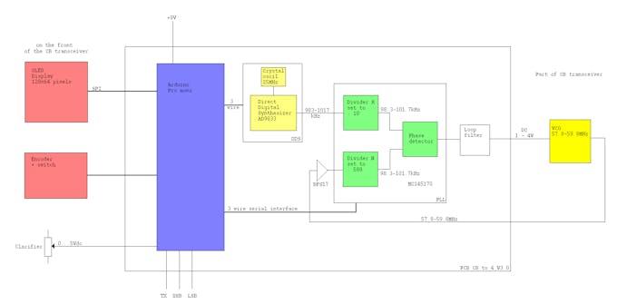 It reads an encoder switch and sends data to an OLED display , PLL and DDS