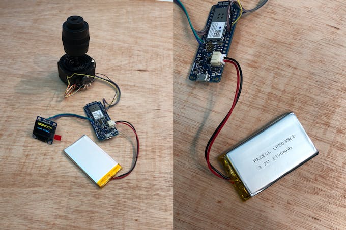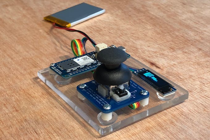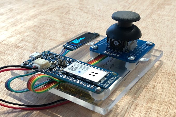 The hardware assembly for this project is relatively simple but special care must be given to the joystick wires as the wire coloring scheme is not intuitive. Use the wiring diagram below to wire up the OLED module and 3-axis joystick to the Arduino MKR1000 board.