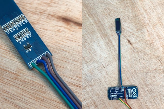 The OLED module uses the I2C bus to communicate between the module and the micro-controller. 4 wires need to be connected between the MKR100 and the OLED module. The photos below depict the wires/colors used in this example.