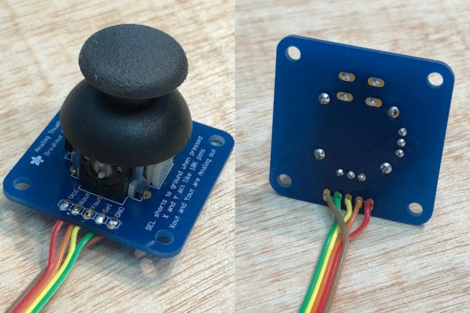 The next step is connecting the 3-axis joystick. The joystick consists of 3 potentiometers (1 for each axis) and 1 momentary switch. First, connect the common VCC and GROUND to each of the 3 potentiometers. The X and Y axis potentiometers have bare terminals exposed and are wired as follows: