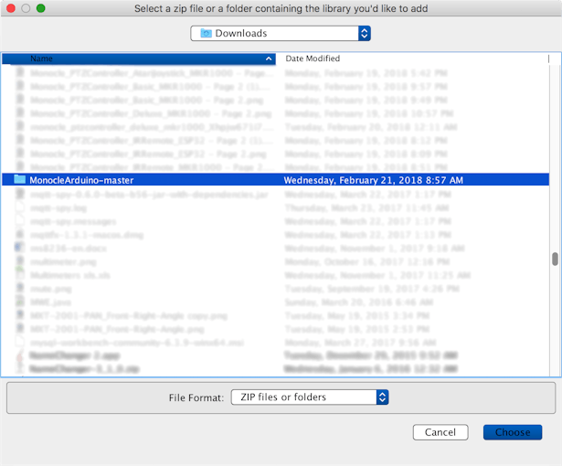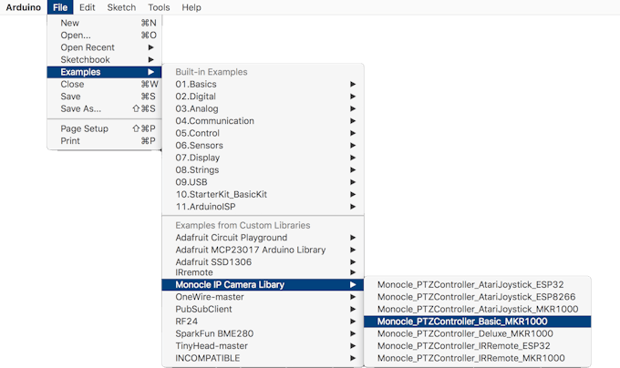 The Monocle Arduino Library and various PTZ Controller projects depend on additional third-party libraries that need to be installed. Fortunately, all these third-party libraries are available and directly installable via the Library Manager in the Arduino IDE.
