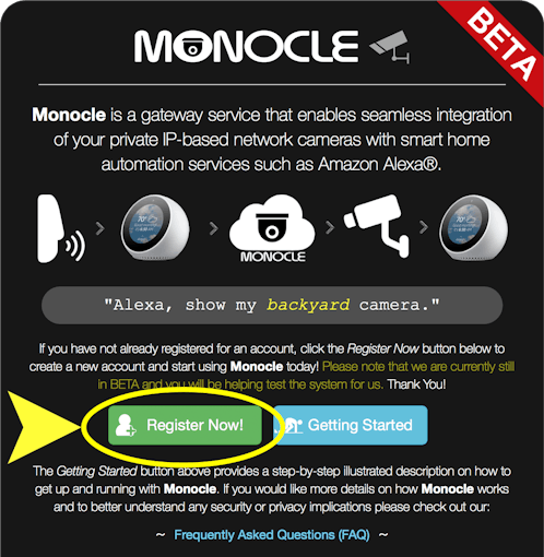 To use the Monocle platform, the user will need to create an account with Monocle. This takes just under a minute to complete by visiting https://MonocleCam.com/ and clicking "Register Now".