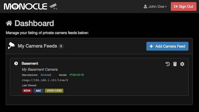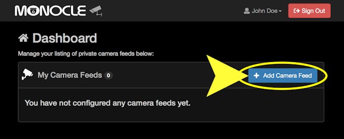Newly registered accounts should already be signed in and on the dashboard page. If not, log into the Monocle account to access the dashboard page to add a camera source/feed to the account.