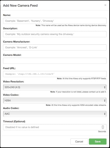 A prompt will appear with a form to enter all the camera feed details including: