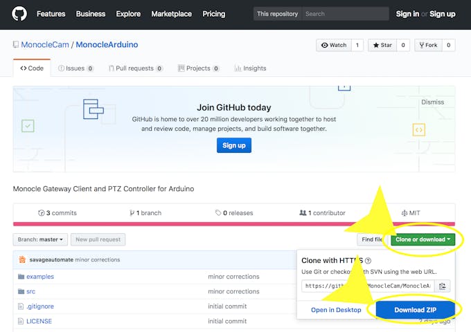 Open a web browser to the Monocle Arduino Library GitHub Repository: https://github.com/MonocleCam/MonocleArduino
