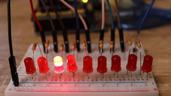 Now we will make a row of 9 LEDs blink one by one, toward one and then back. Using pin 2-10.