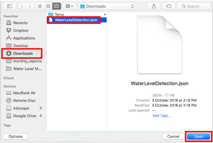 1. Download the blueprint of the Water Level Detection scenario attached in the code section of this project. Remember to save the file with the filename 'WaterLevelDetection.json'.